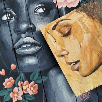 En effet, depuis mes débuts sur bois (de palette), il y a déjà dix ans, j’ai cette envie de rendre hommage à ce matériau que j’aime tant. À cette matière vivante et veinée. Depuis le début, je cherche la manière de laisser le bois partiellement apparent comme s’il était lui même la peau de mes portraits.