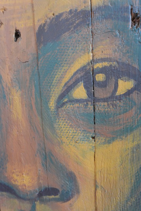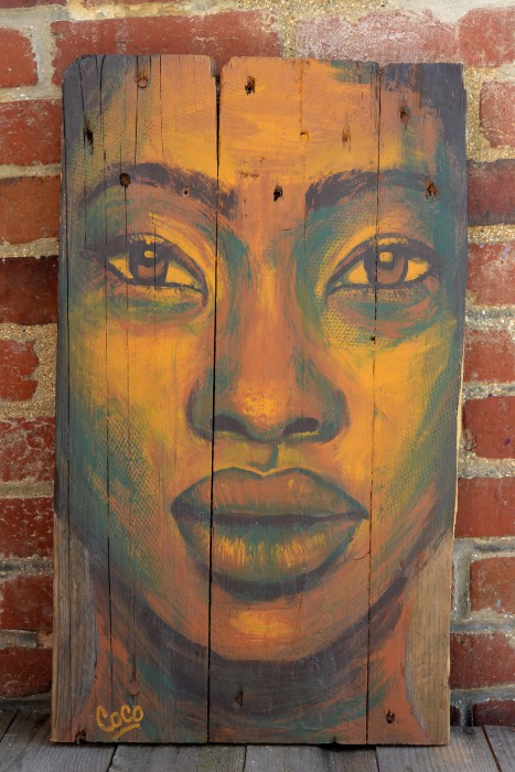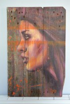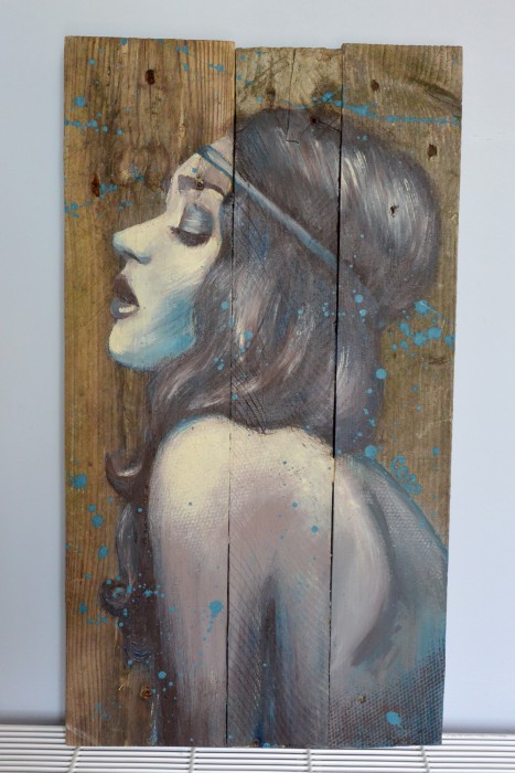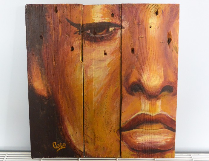 Je vous présente donc « Maya », portrait réalisé à l’acrylique sur un châssis conçu à base de bois de palette, et qui mesure 60 x 37,5 cm.